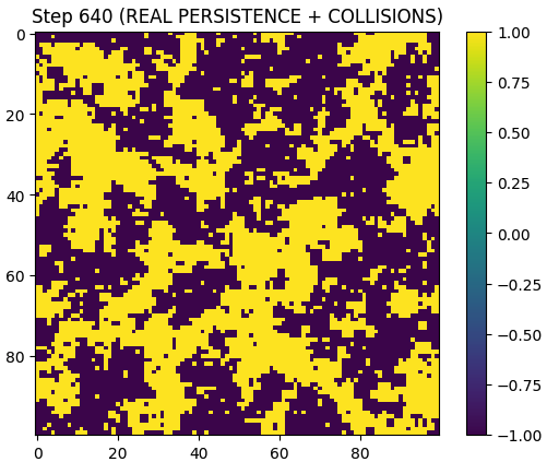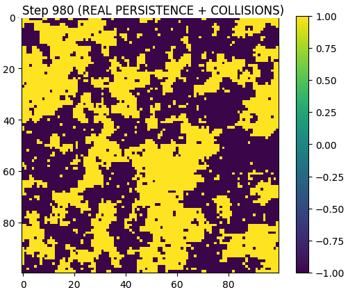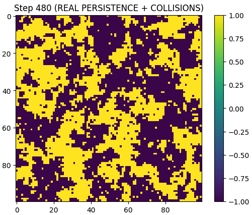 A 2D system evolves with mechanisms for persistence and interaction. The simulation includes nonlinear effects allowing structures to form and interact.